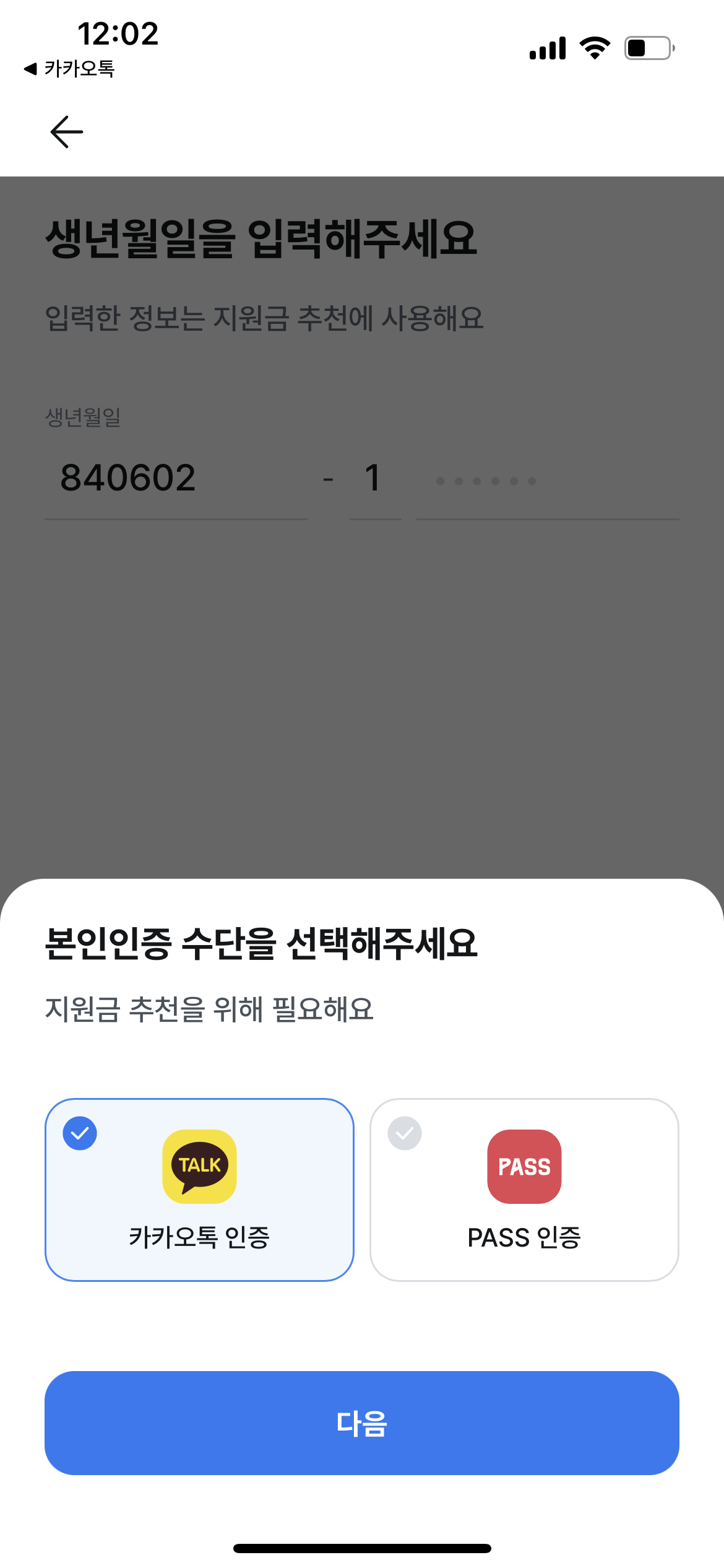 📌생년월일 입력 후 카카오톡 인증 또는 PASS인증 중 한가지 선택